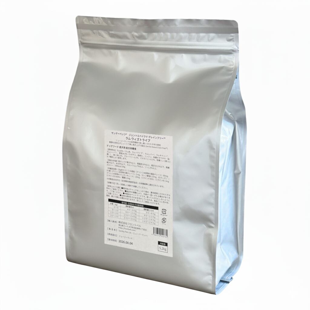 ●原材料:ラム64%(ラム肉、ラムトライプ*、ラムレバー*、ラムキドニー*、ラムハート*)、野菜34.9%(カボチャ、亜麻仁、ニンジン、有機オオウキモ(海藻))、緑イ貝0.2%、ブルーベリー0.2 %、マヌカハニー0.1%、有機リンゴ酢0.1% *季節により使用します。