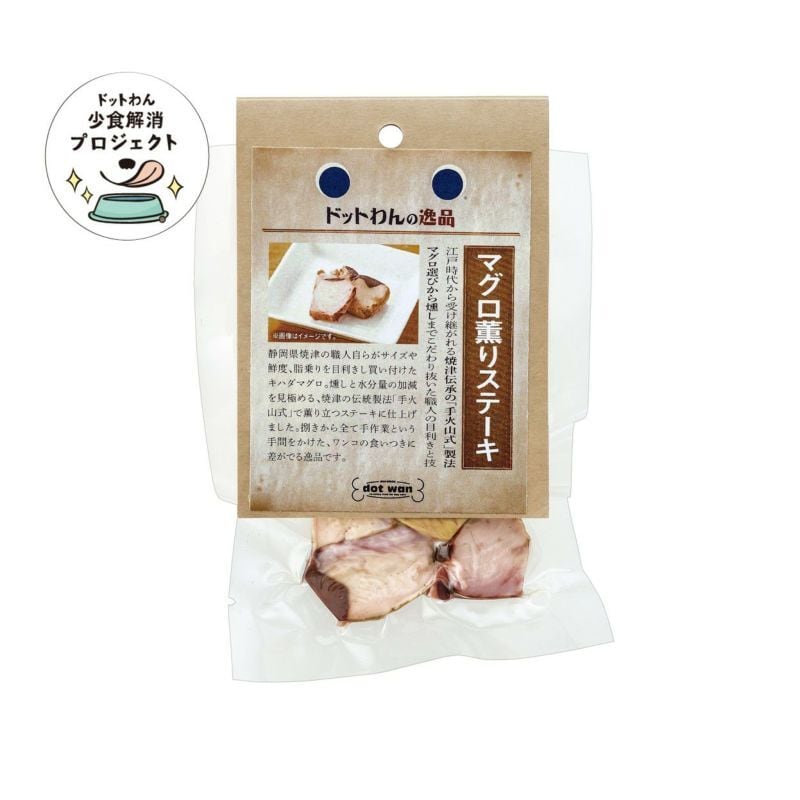 静岡県焼津の職人自らがサイズや鮮度、脂乗りを目利きし買い付けたキハダマグロ。かまどの直火でじっくり燻しながら乾燥させる焼津の伝統製法「手火山式焙乾」で薫り立つステーキに仕上げました。捌きから全て手作業という手間をかけた、ワンコの食いつきに差がでる逸品です。