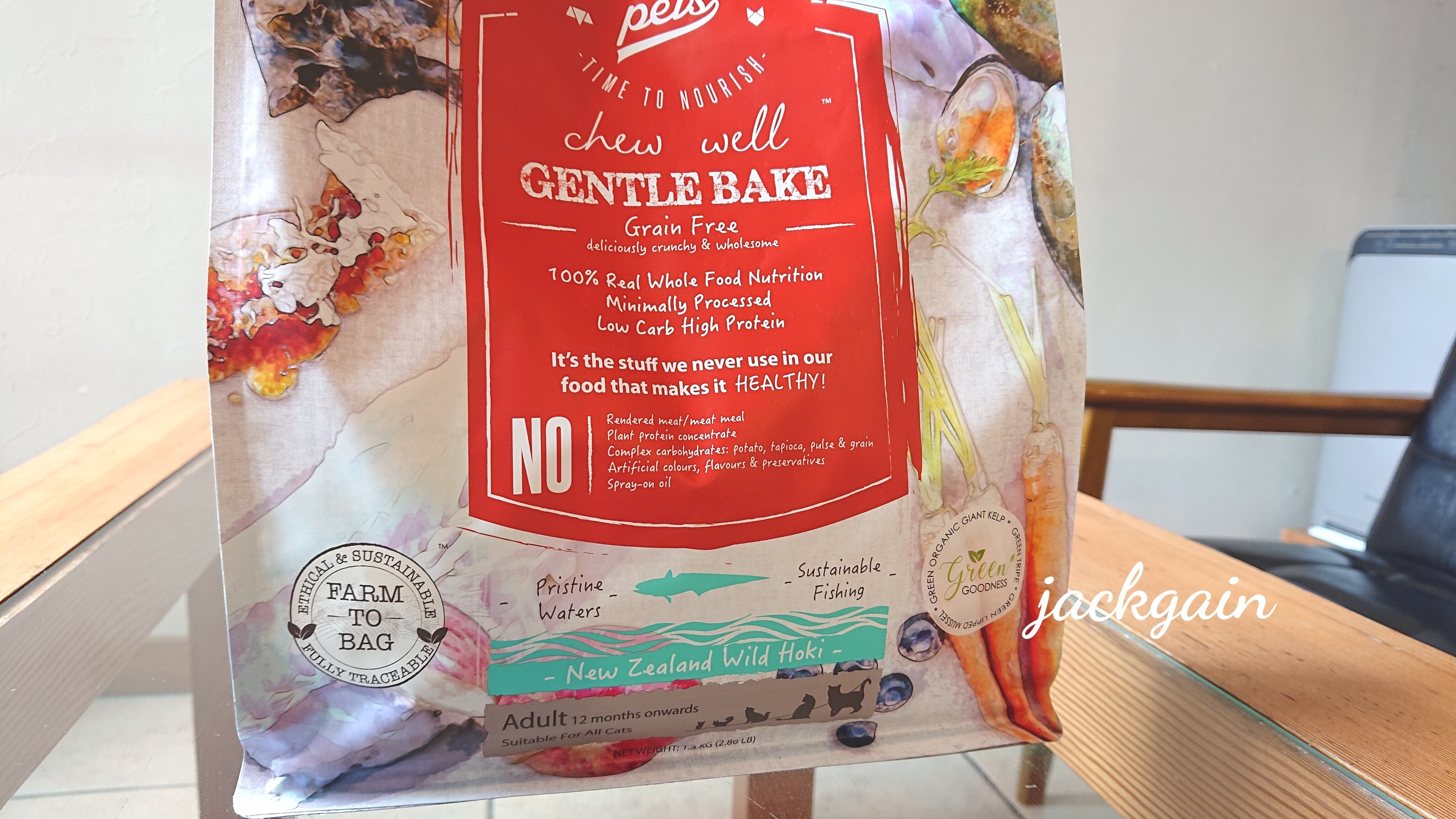 ホキ64%(ビーフトライプ*、ビーフレバー*)、野菜34.9%(カボチャ、亜麻仁、ニンジン、オオウキモ(海藻))、緑イ貝0.2%、ブルーベリー0.2%、マヌカハニー0.1%、有機リンゴ酢0.1%
